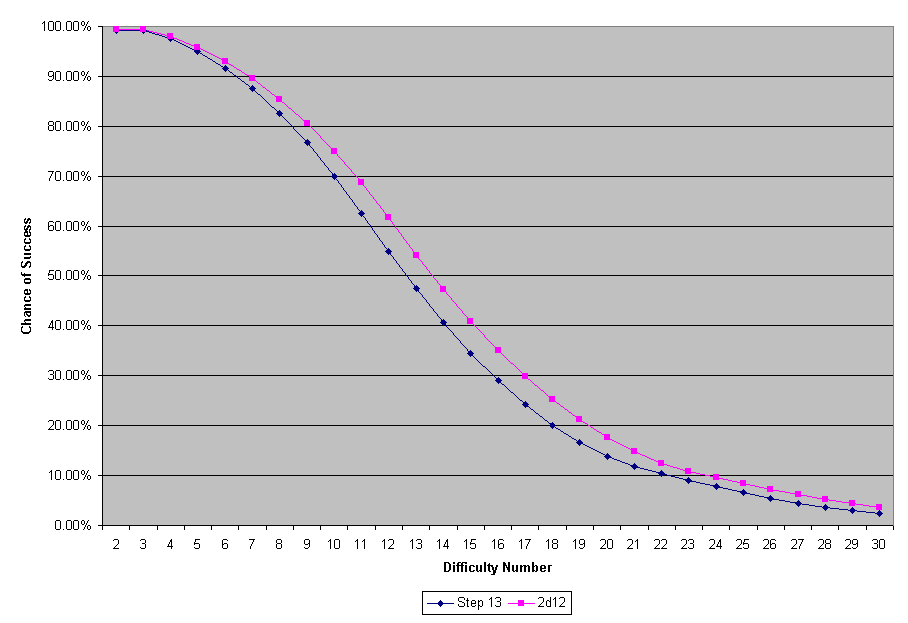 Second, while the average result (and therefore the overall chance for success) is higher for Step 14, there is a range of Difficulty Numbers (2 through 9) where it is actually more advantageous to roll Step 13 instead of Step 14. The difference is most significant with a Difficulty Number of 6 (almost a 3% better chance of success with Step 13).